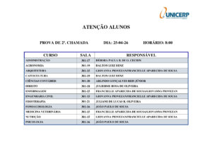O UNICERP informa os horários das provas de segunda chamada. Recomendamos que os alunos confiram atentamente as datas, os horários e demais informações disponíveis no documento abaixo. Em caso de dúvidas, entre em contato com a coordenação do seu curso.